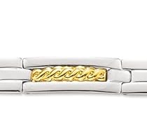 This sleek stainless steel bracelet has attractive carved yellow gold on its links. You are a stylish hunk with this 18k Yellow Gold Carved Men's Stainless Steel Bracelet.[]